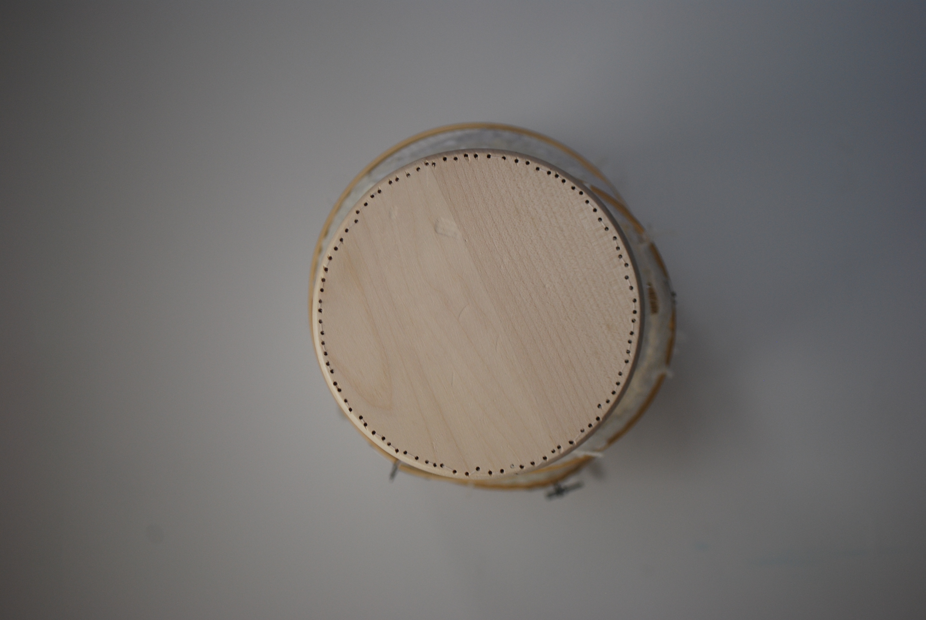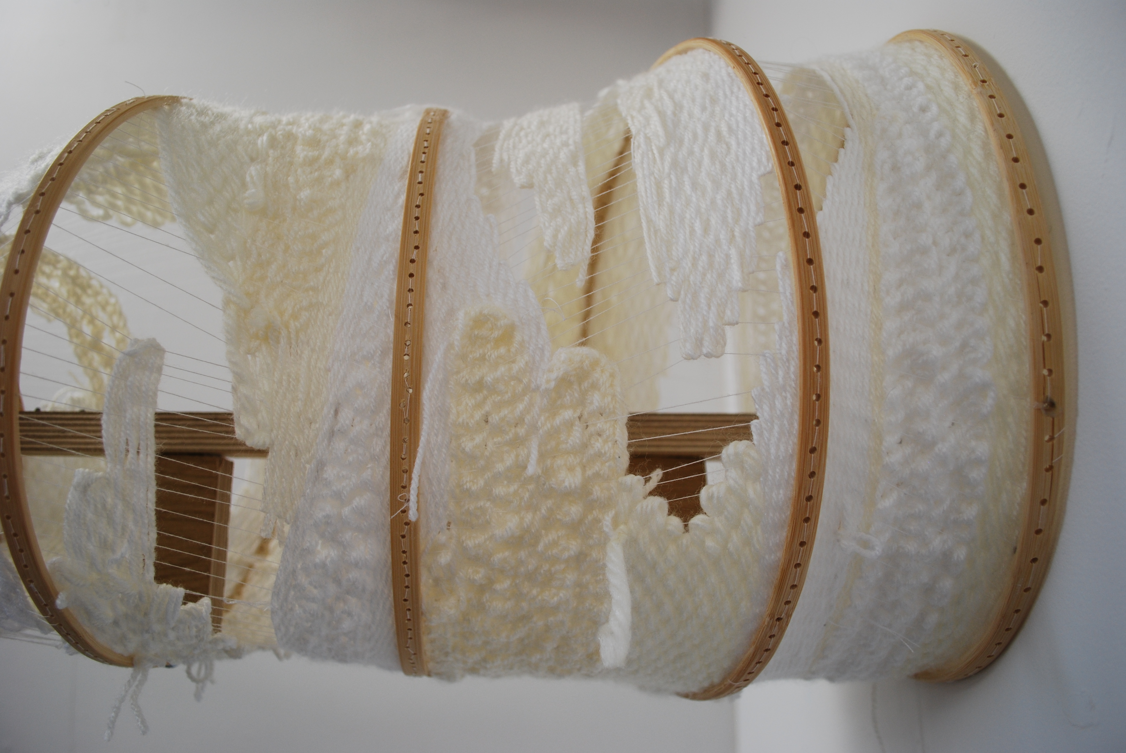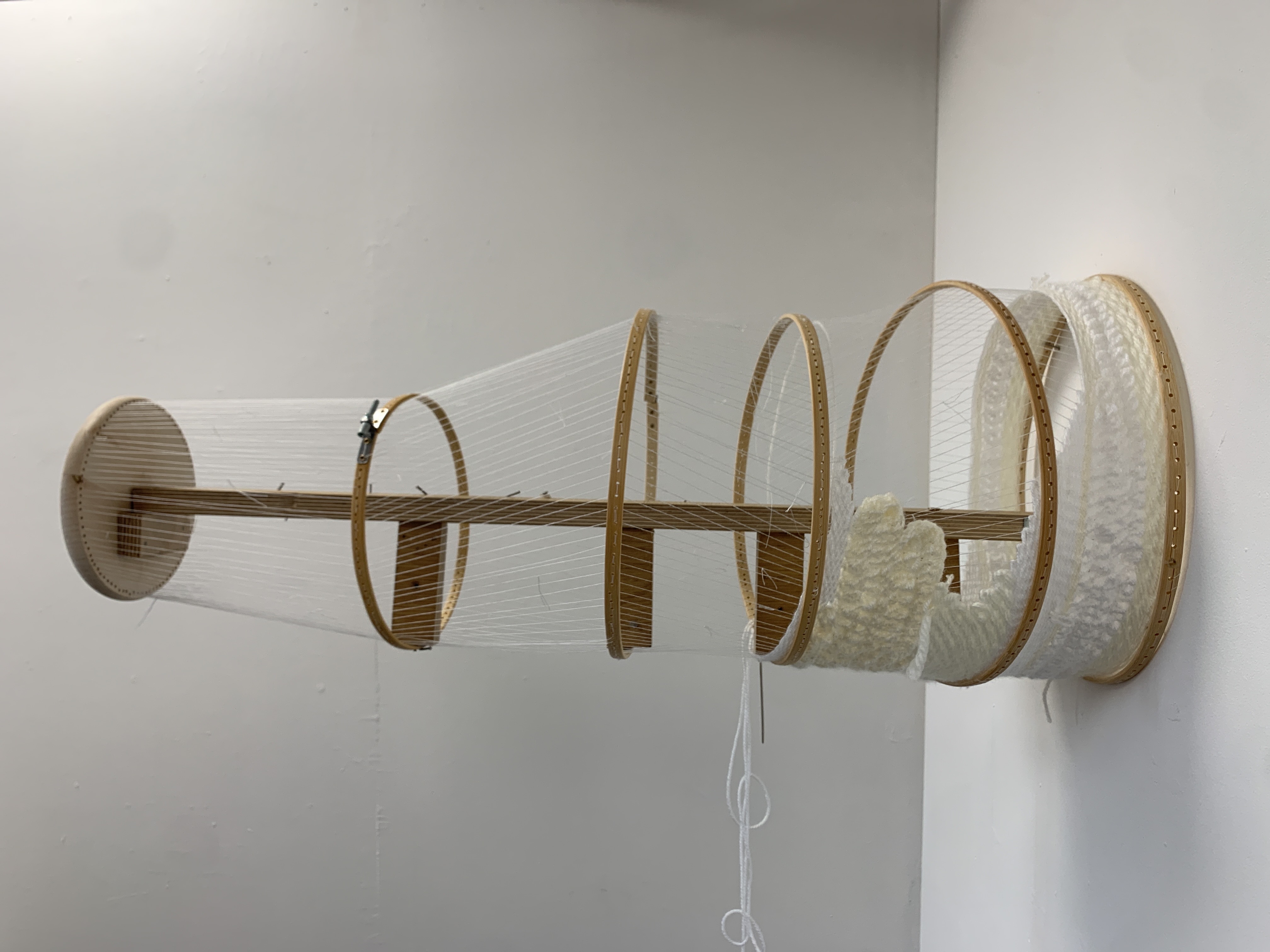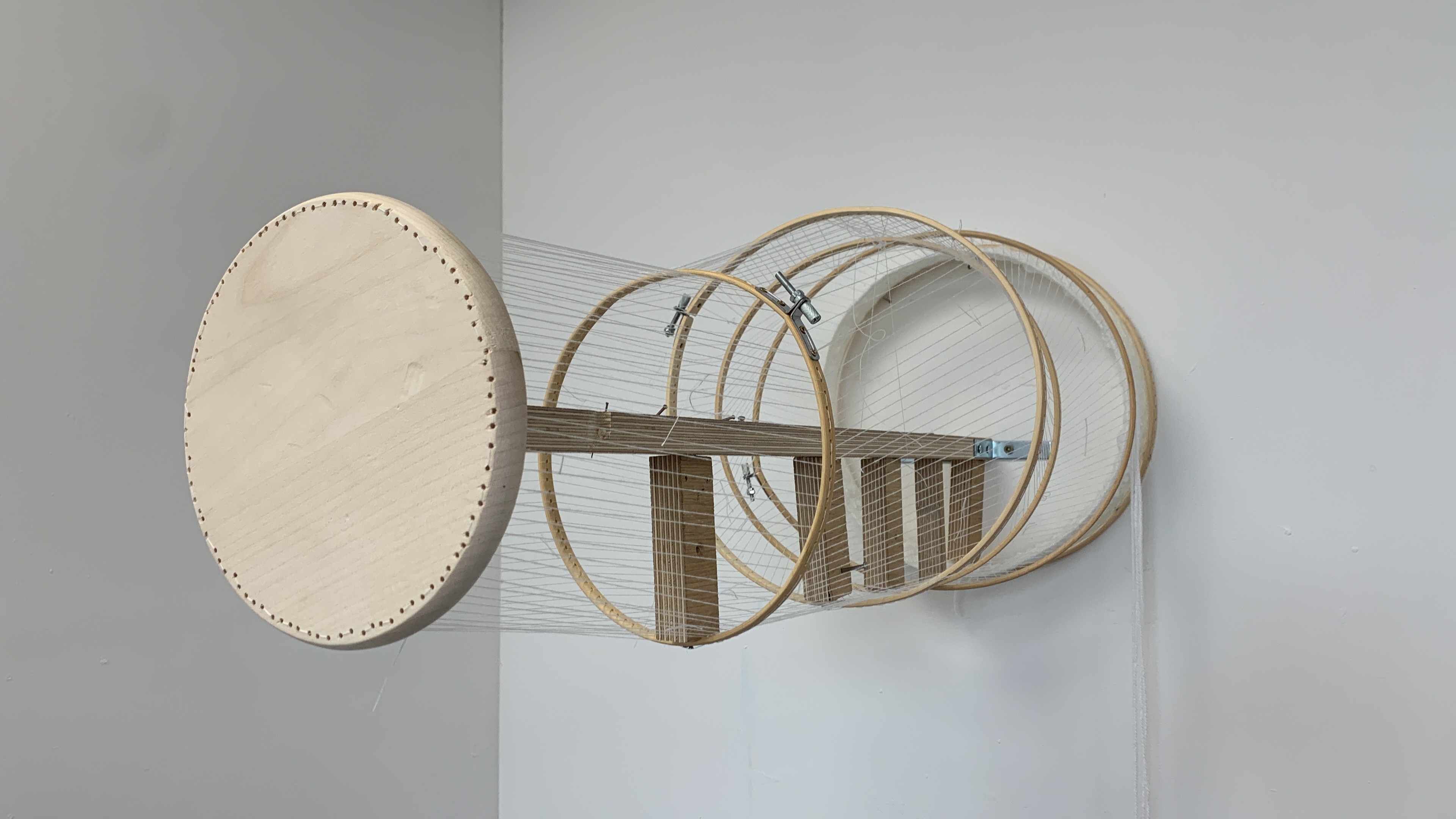 This piece has a wodden skleteon held together by nails, skrews and hot glue. The piece is fastened to the wall and is not removable without damaging the piece. The work is placed on the wall in a fashion that brings attention to different aspects of the piece. As you first enter the space you can see only the solid end circle, as you move through the space the piece is revield.